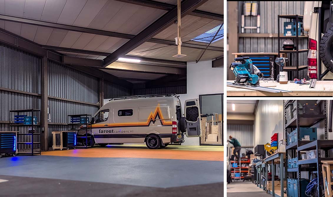 De zelfbouwwerkplekken bij Far Out Campers zijn fijne, ruime werkplekken, waar je kunt bouwen aan jouw camper. Je krijgt je eigen plek met een gevulde gereedschapskar, werkbanken en een stellingkast voor je spullen. Plus een gezamenlijke werkruimte waar nog veel meer gereedschap staat, klaar om jou te helpen bij al jouw klussen.