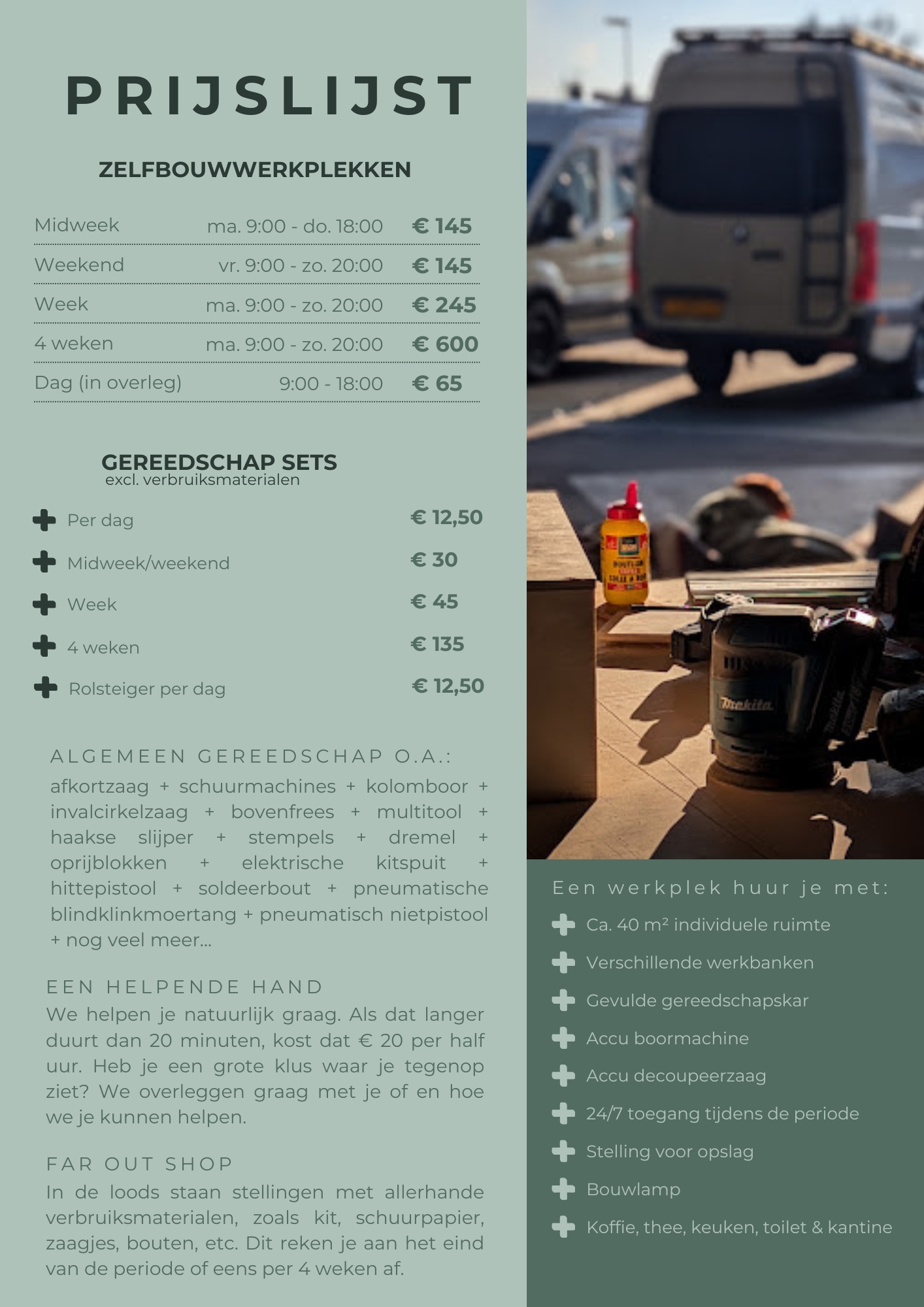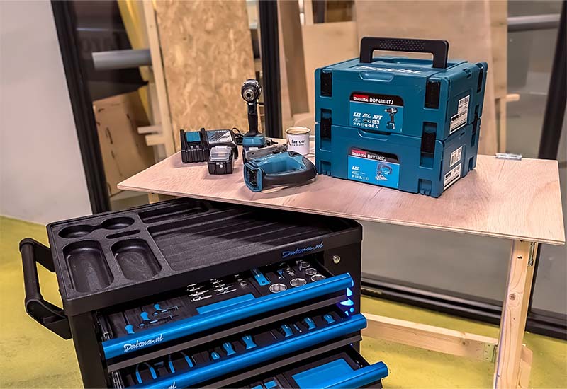 Als je net wat meer power nodig hebt, hebben we een uitgebreide gereedschapskast met gezamenlijk gereedschap. Denk aan dingen als een afkortzaag, kolomboor, pneumatische blindklinkmoertang en nog veel meer. Dit kun je per dag bijhuren, zodat je niet al dat gereedschap zelf hoeft aan te schaffen.